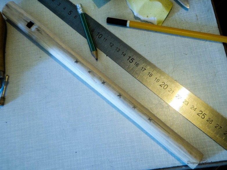 Сначала берем деревянные брусочки и размечаем их. Нужно нарисовать границы внутреннего канала свирели, с одной стороны бруска этот канал 1,5 см в ширину, а с другого, 1 см, то есть, канал будет слегка сужаться к концу свирели.