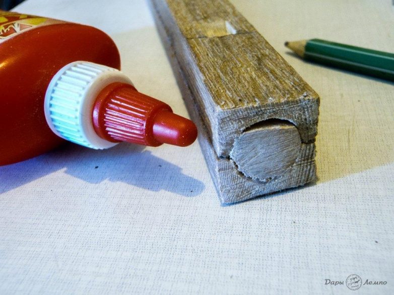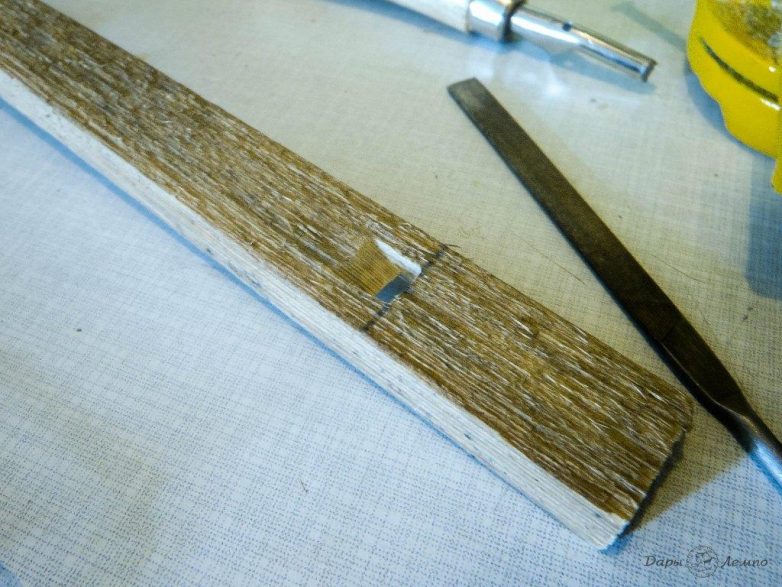 Когда клей высохнет, раскручиваем струбцины и берем нож. Срезаем верхнюю часть маленькой деревянной втулки, примерно 1,5 мм, так, чтобы получилась плоская ровная грань. Посмотрите на фото, и все станет ясно.
