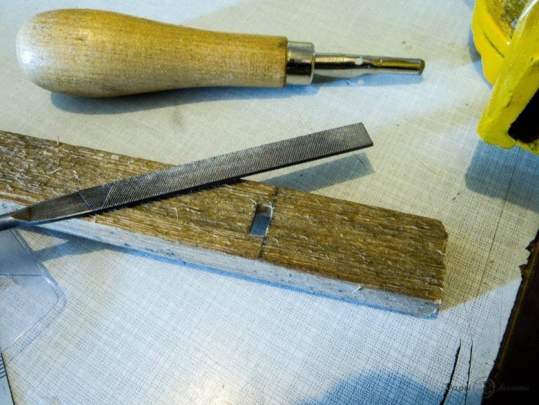 После этого тем же надфилем стачиваем одну сторону окна под углом примерно 30-45 градусов. Это самая ответственная часть работы: от остроты и гладкости грани будет зависеть качество звука.