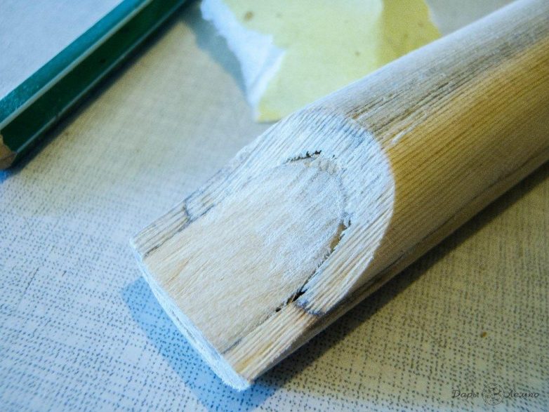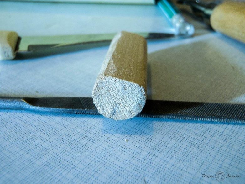 Ждем пока клей высохнет, и беремся за нож. Аккуратно остругивая заготовку, придаем ей округлую форму, потом заглаживаем шкуркой.