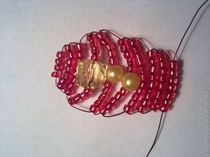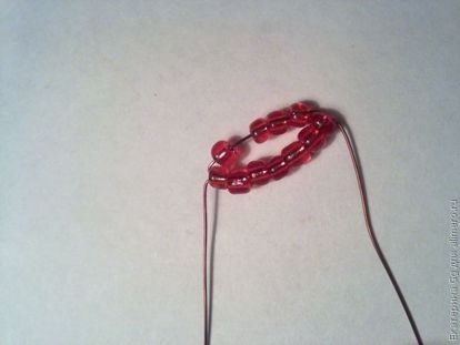 1) Одеваем на проволоку 85 см 11 бисеринок красного цвета, другим концом проволоки проходим через 7 бисеринок, затягиваем.