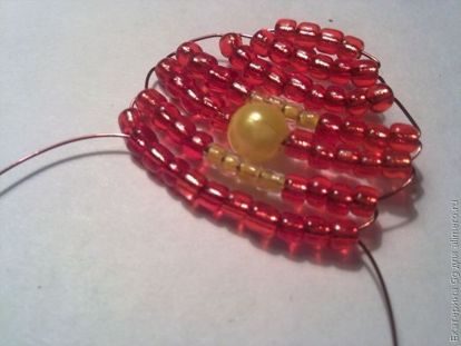2) 2 На один конец проволоки одеваем 9 красных бисеринок, другим концов проволоки проходим через эти бисеринки, затягиваем.