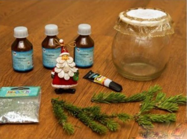 Вставляем фигурку или веточку ели, можно и то и другое.Добавляем блесток.