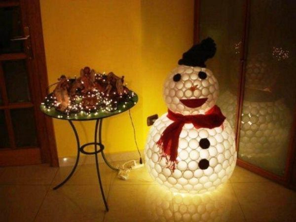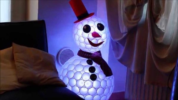 Снеговик готов, остается украсить его на свое усмотрение. Можно повязать на шею шарфик и надеть шляпу. Если вставить внутрь лампочку, получится забавный светильник.