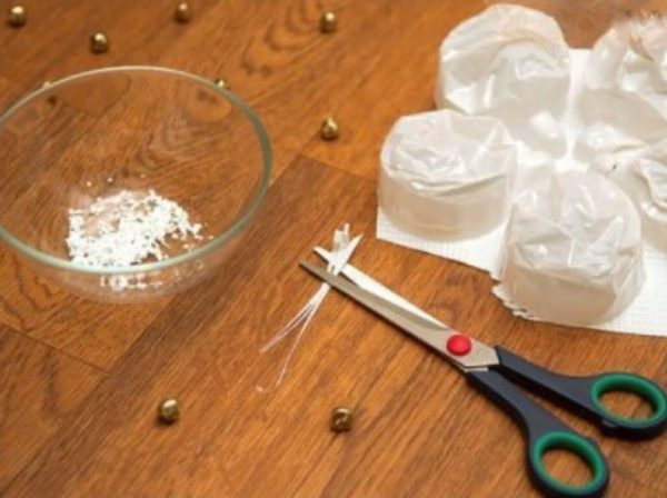 Сверху будущего колокольчика одеваем пакет или воздушный шарик, хорошенько промазывая клеем.