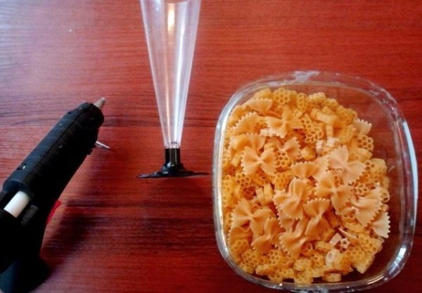 Приклеиваем макароны к стаканчику начиная с самого низа, постепенно, поднимаясь по кругу к верхушке.