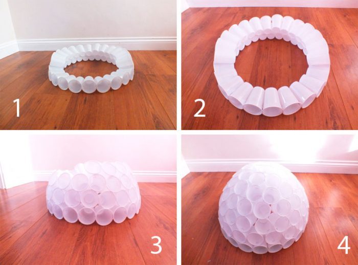 Сделайте голову таким способом: выложите 18 стаканчиков по кругу вовнутрь дном и скрепите их между собой степлером. Последующие ряды выкладывайте в шахматном порядке и фиксируйте степлером стаканчики между собой и между рядами. Шар должен остаться сверху закрытым.