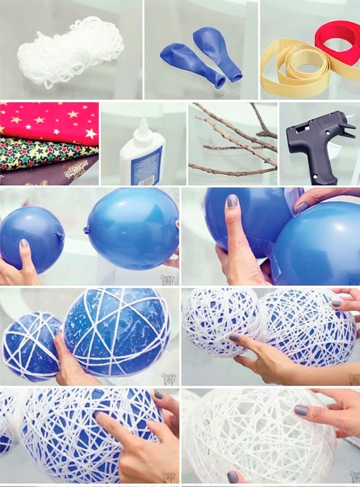 Обмотайте шары нитками в хаотичном направлении, а в области шеи несколько раз.