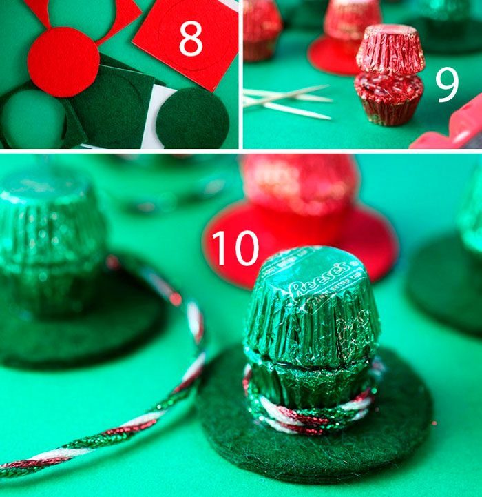 Склейте 2 конфеты и приклейте их на фетровый круг, сформировав шляпку-цилиндр, затем место крепление оберните шнурком.