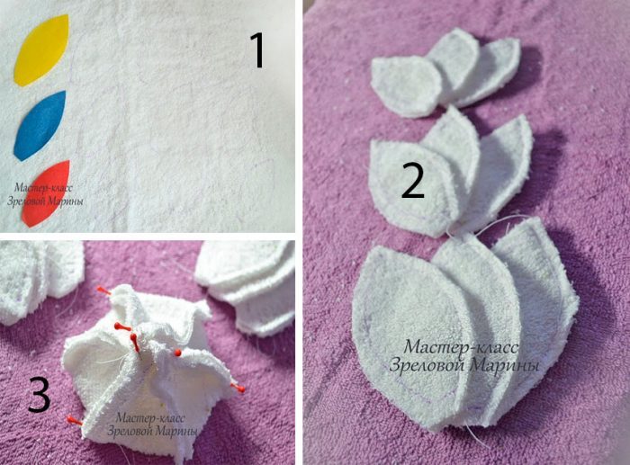 Скрепите булавками по 3 детали, прострочите на машинке, выверните и наполните холофайбером.
