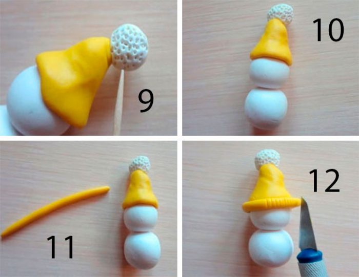 Слепите конус из жёлтой глины, затем прикрепите его к голове с помощью зубочистки.