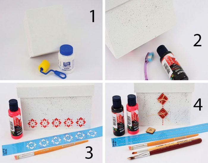 Перенесите узор, украсив самую большую коробку.Приклейте пуговки на коробочку средних размеров.
