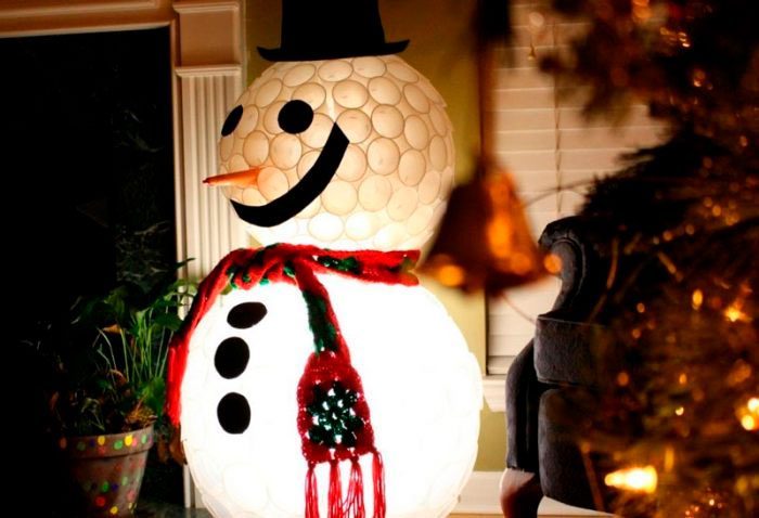 Поместите ёлочную гирлянду внутрь снеговика, затем включите её, чтобы снеговик светился.
