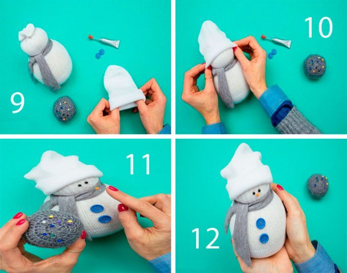 Приклейте ручки с обратной стороны снеговика под шарфик.