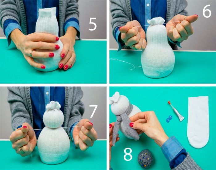 Придайте форму телу снеговика и завяжите верхнюю часть ниткой.Перевяжите ниткой шею снеговика, отделив голову от тела.