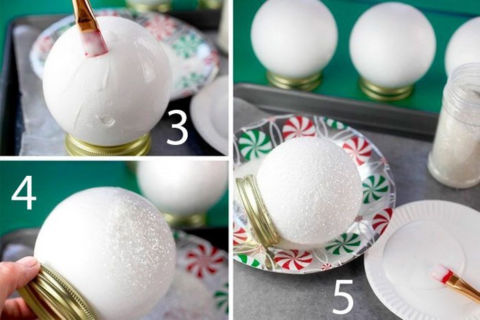 Прикрепите шар к крышке банки, используя клеевой пистолет.Смажьте шар пва и посыпьте блёстками.
