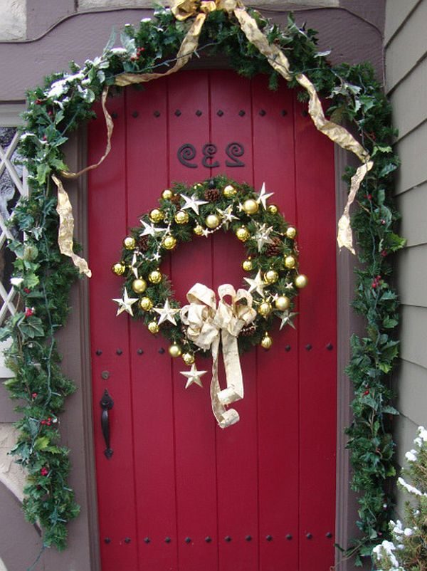 Не хотите венок вешать тогда можно украсить дверь еловыми ветками, мишурой, гирляндой и елочными шарами. Тоже не плохо получается.