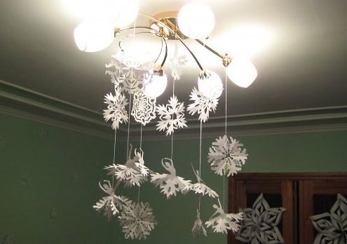 Люстры и светильники также не забываем привести в праздничный вид. Для этого можно также взять елочные украшения или вырезать несколько снежинок из бумаги. Вот несколько примеров.