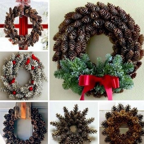 Берем небольшой обруч и при помощи клея или проволки крепим ветки или шишки о кругу создавая красивую композицию. В конце шишки можно покрасить белой краской и элементами новогоднего декора.