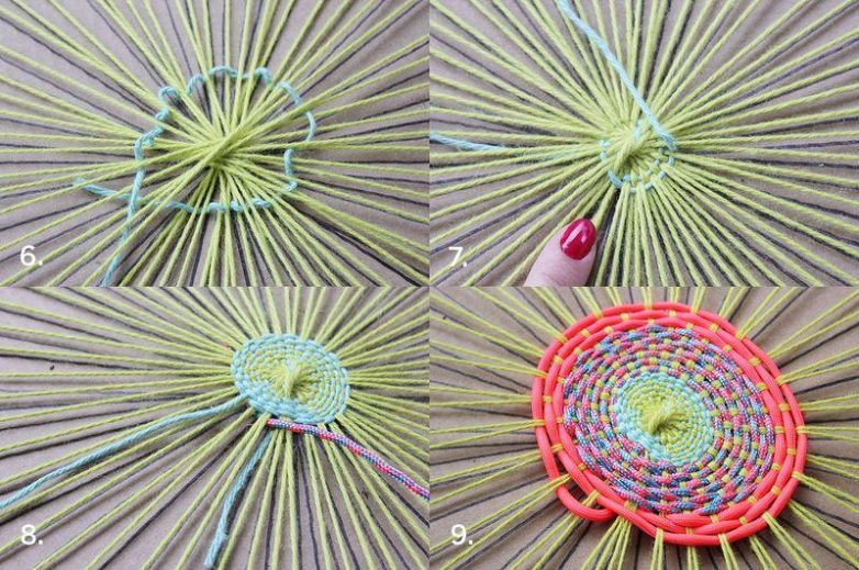 Так как в центральной части круга каркасные нити расположены плотно друг к другу, советуем начать плетение с тонкой пряжи. Отрежьте около двух метров пряжи, один край протяните под нитями, оставив хвостик длиной около 10 см. Начните оплетать каркасные нити по схеме 2 через 2. Вплетя пряжу по кругу, следующий оборот плетите так, чтобы нити, которые на предыдущем этапе оказались снизу, теперь были сверху. Хорошенько натягивайте пряжу, чтобы ряды были сплетены максимально плотно.