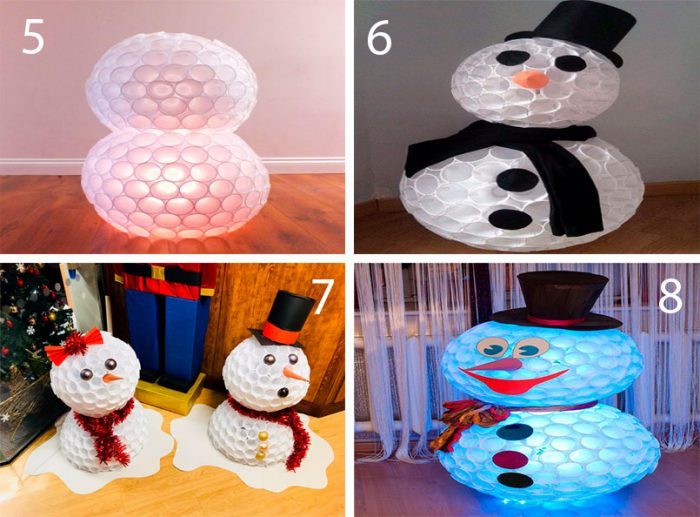 К Новому году так и хочется создать оригинальную тематическую поделку. Светящийся снеговик из пластиковых стаканчиков очень креативно украсит Ваш дом, а сделать его достаточно просто. В этой статье мы рассмотрим: как сделать снеговика из пластиковых стаканчиков своими руками.