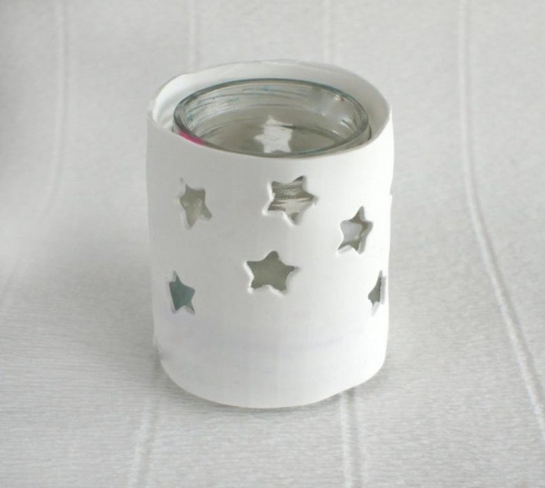 Даем остыть нашим подсвечникам. При необходимости мелкие неровности шлифуем шкуркой. Аккуратно помещаем внутрь свечи и любуемся красивыми узорами.