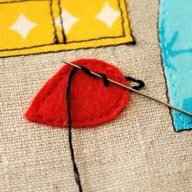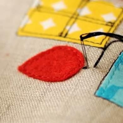 Настало время сделать аппликацию с птичкой, для чего очень удобно использовать тонкий, листовой фетр. Тельце птички можно нашить на домик вручную или на швейной машинке, а вот лапки, клювик и глаз точно надо будет вышивать руками.