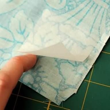Вырезаем бумажный шаблон основной детали домика, накрываем его кусочком флизелина чуть большего размера и накладываем на оборотную сторону основной ткани. Получившиеся слои проглаживаем горячим утюгом, согласно инструкции к флизелину, скрепляя слои между собой.
