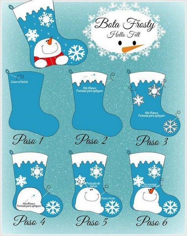 Пошаговая схема изготовления сапожка со снеговиком.
