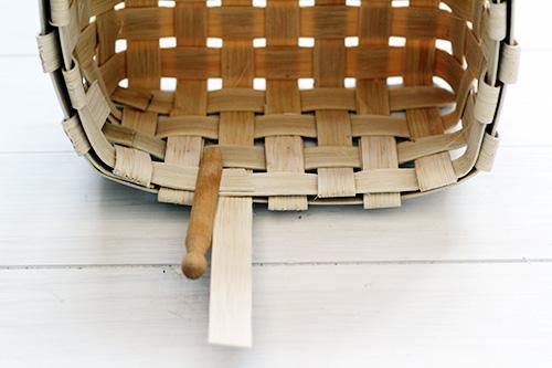 Обрежьте остатки полос, вплетенных в стенки корзины из шпона, оставив запас примерно в 5 см. Вплетите оставленные части полос в стенку, которую плели первой.