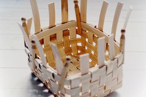 Корзинка из шпона обретает форму. На этом этапе можно вплести еще несколько полосок в стенки, чтобы добиться желаемой их высоты.