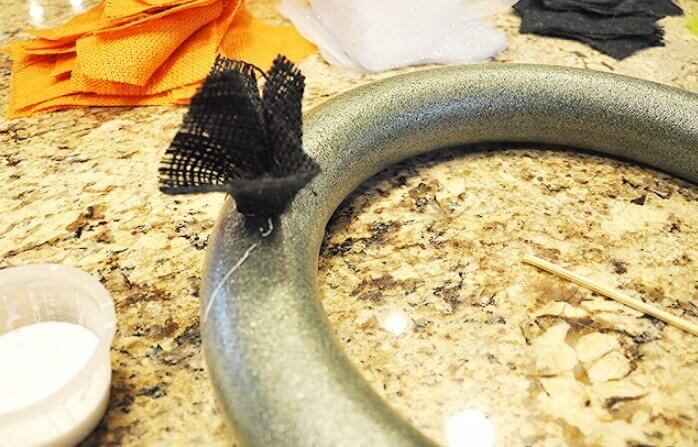 Другая техника создания венка из фатина. Нарезаем материал на тонкие длинные полоски (5*12 см) и обвязываем их по всему периметру кольца.