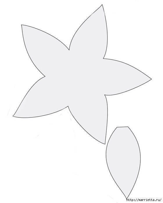 Из бумаги нужно вырезать по приведенному ниже шаблону три детали. Делаем на лепестках сгибы по середине и немного завьем концы карандашом.
