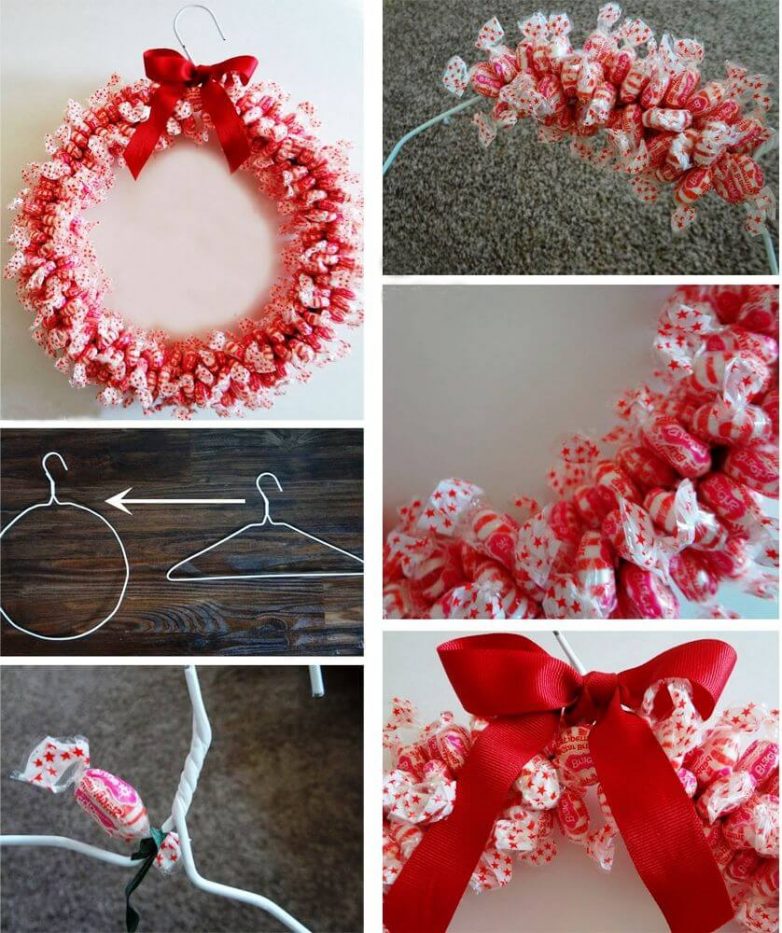 Сладкоежки точно захотят поучаствовать в создании такого вкусненького и манящего веночка.Его также можно сделать разными способами. Самый простой вариант — склеить или связать конфетки между собой.