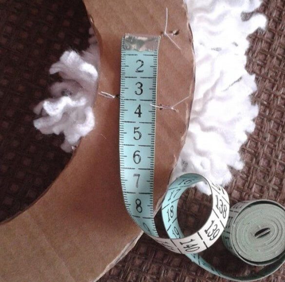 В картоне делаем толстой иглой два отверстия, в которые мы протянем концы ниток помпона и свяжем их с изнаночной стороны.