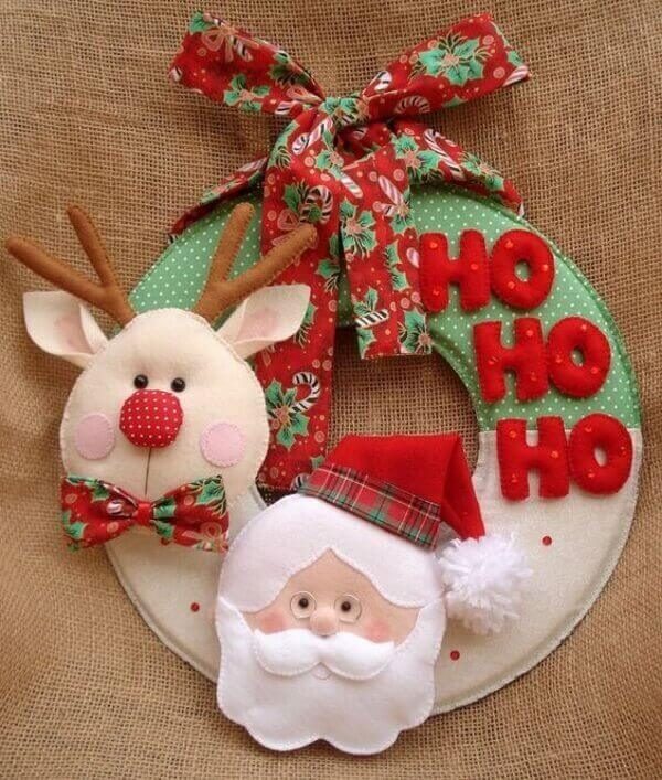 Основу можно сделать и тканевую. Для этого вырезаем из ткани два кольца. Сшиваем их друг с другом. Выворачиваем и набиваем ватой или синтепоном. А украшать будем Морозом и оленем из фетра.
