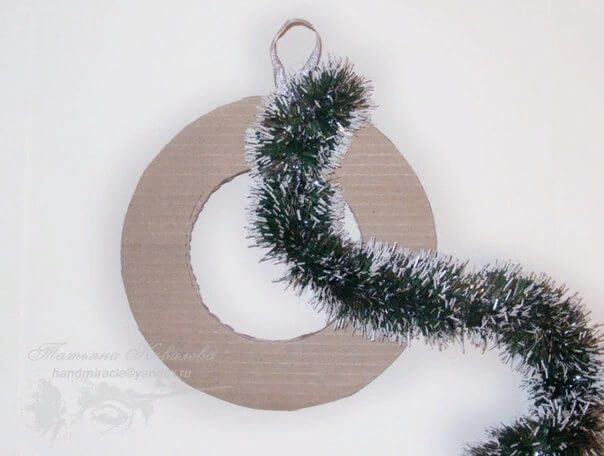 Поверх нее обматываем мишуру, прижимая витки близко друг к другу. Обязательно зафиксируйте края проволокой или нитями. Иначе венок распадется.