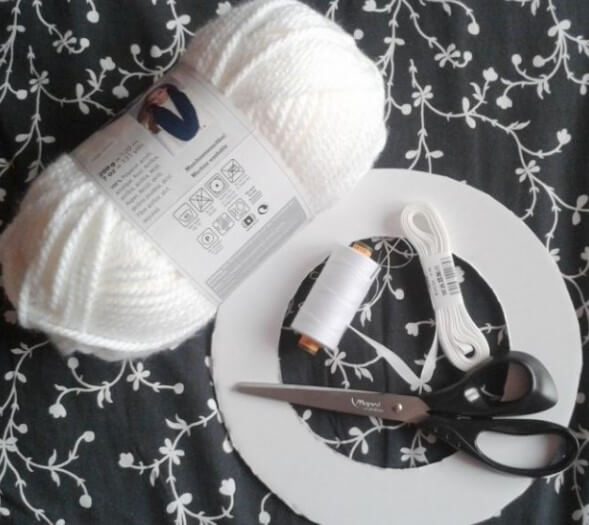 Нужно взять картонную основу, пряжу, нити, ножницы и иглу.