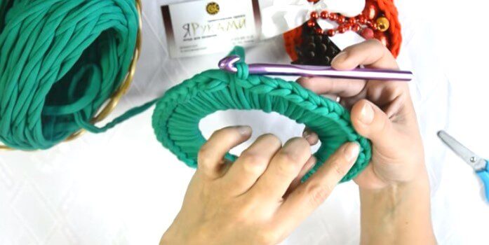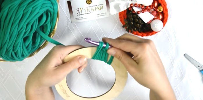 Простая идея из трикотажной пряжи, вяжем крючкомОчень просто и быстро делается обвязка основы трикотажной пряжей. Для этого вам нужно будет умение делать столбики без накида. А взять нужно основу из картона или фанеры, пряжу и крючок.