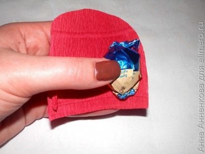 Получается два лепестка. Каждый из них по середине я растягиваю в разные стороны, подготавливая место для сюрприза-конфетки. Работать с итальянской гофрированной бумагой очень легко. Она прекрасно растягивается и хорошо держит форму.