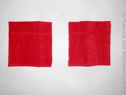 Из гофрированной бумаги красного цвета я вырезаю два квадрата размером 7х7 см. Очень важно резать поперек линий гофрирования.