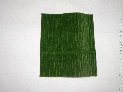 Теперь нужно сделать чашелистик. Для этого из зеленой гофрированной бумаги я вырезаю прямоугольник размером 7х6 см.