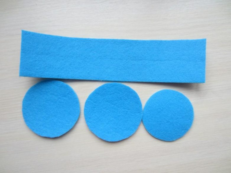 Вырезаем из фетра два круга диаметром 8 см, один 7,5 см и прямоугольник 25×6 см.