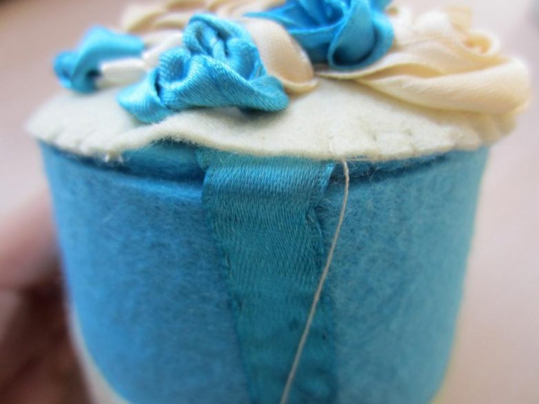 Крышка украшена вышивкой лентами и косой бейкой из ткани. Подробнее о технике вышивке лентами вы можете узнать в одной из статей на сайте.