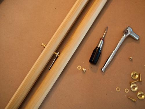 Сквозь отверстия в двух ножках проденьте длинный бол, а между ними на ось наденьте второй болт с кольцом. Установите шайбы и колпачковые гайки. При необходимости болт можно отпилить до нужной длины. Затягивать гайки нужно так, чтобы соединение оставалось подвижным, но не возникало слишком больших зазоров.