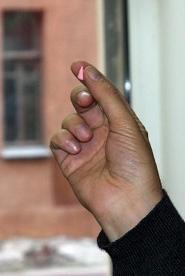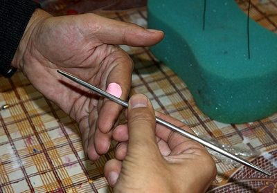 Отщипываем еще одну горошинку, кладем на ладонь. Берем вязальную спицу или стек и раскатываем так, как показано на фото. Лепесток должен получиться очень тонким, прозрачным на просвет.