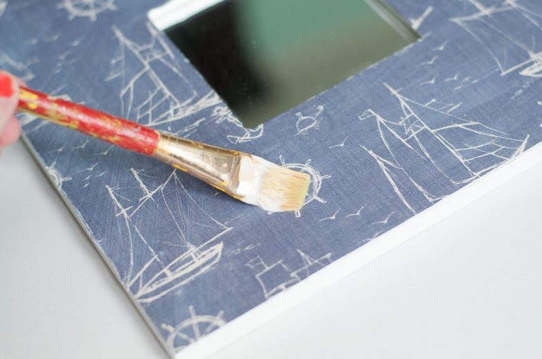 2. Берем салфетку для декупажа, нам подошла морская тематика. Вырезаем нужный размер квадрата по контуру рамки. Отделяем от салфетки два нижних слоя, они не нужны. Берем только верхний — с рисунком.
