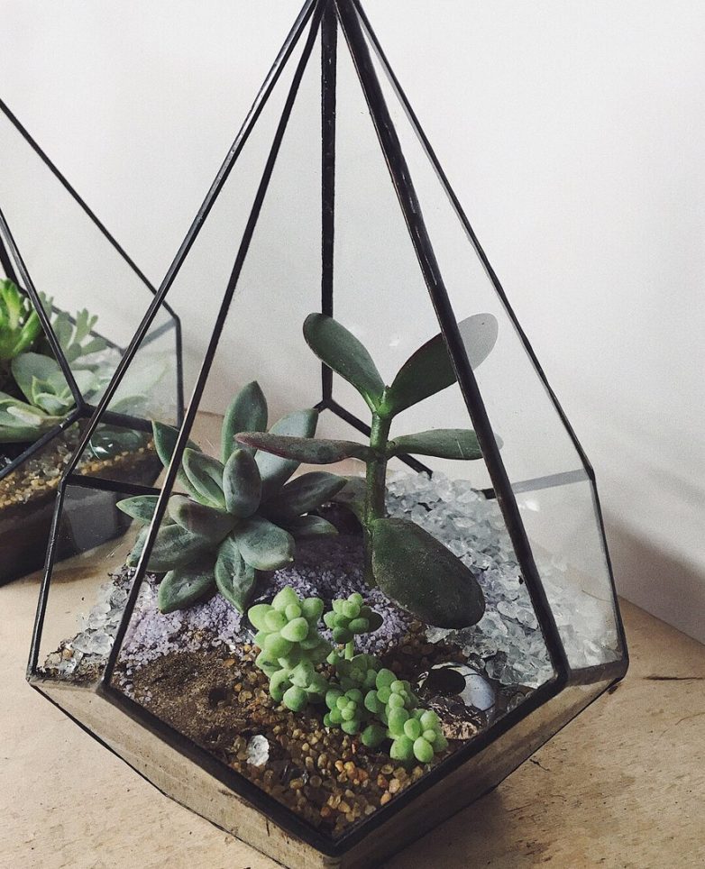 Я же влюблена в не обычные флорариумы из стеклянных чаш, а в их собратьев с замысловатой формой.Например, формы «Кристалл», «Капля» или другие варианты смотрятся очень стильно и гармонично сочетаются с интерьером, потому что полностью прозрачные. От вас зависит только, какого цвета будет окантовка краев.