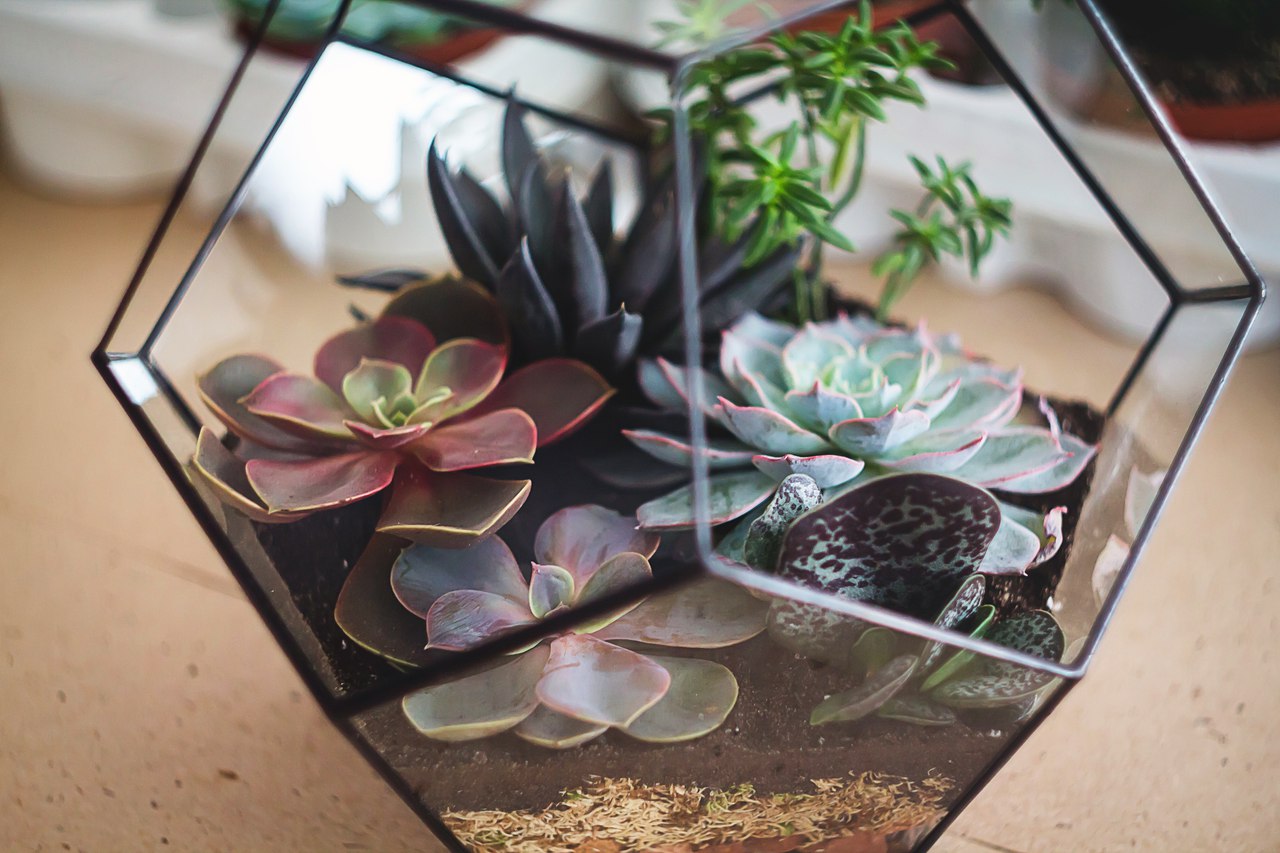 Флорариумы — это кашпо для растений, которое имеет небольшую зону проветривания, поэтому культуры, растущие внутри, произрастают в более влажном микроклимате.