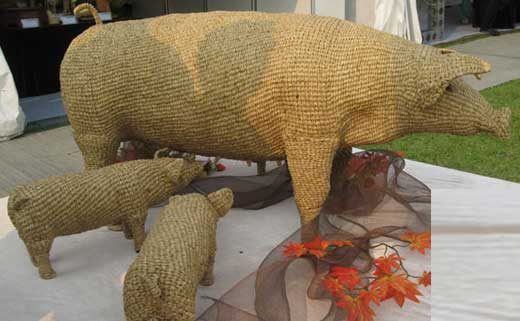 Или красивую композицию, где пластиковый каркас обтянут мешковиной. Меня этот вариант свинок очень впечатлил.